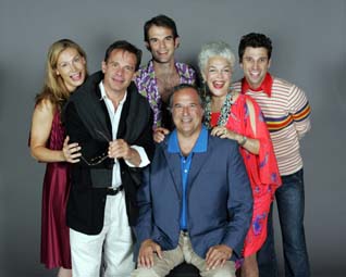 The cast of IN THE WINGS, (standing left-right) LISA DATZ, PETER SCOLARI, BRIAN HENDERSON, MARILYN SOKOL and JOSH PRINCE, and (seated) playwright STEWART F. LANE. Photo by Carol Rosegg.